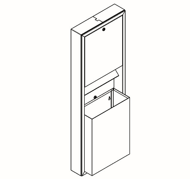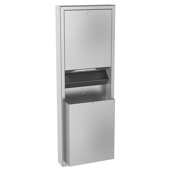 Papierhandtuchspender und Abfallbehälter Kombination für Aufputzmontage, Chromnickelstahl, Oberfläche seidenmatt, Materialstärke 0,8 mm, gekantete Front, beide Teile mit Zylinderschloss und KWC Einheitsschlüssel, Papierhandtuchspender mit Fassungsvermögen 500 - 800 Stück je nach Fabrikat und Faltung, Abfallbehälter mit Fassungsvermögen zirka 23 Liter, inklusive Edelstahlschrauben und Dübel.