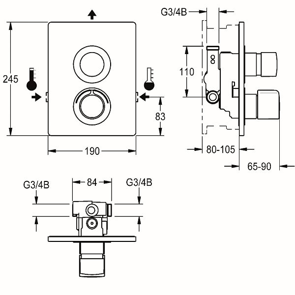 F5S-Therm Selbstschluss-Thermostatbatterie DN 15 als Fertigbauset zur Wandeinbaumontage im Rohbauset, für Duschanlagen. Hydraulisch gesteuert, zum Anschluss an Warm- und Kaltwasser. Funktionsblock mit integrierter FRAMIC Selbstschlusskartusche und Thermostat. FRAMIC Selbstschlusskartusche, wartungsarm und stagnationsfrei, mit Keramikscheibentechnik, selbsttätig schließend, fließdruckunabhängig durch mediengetrennte Bauart. Fließzeit stufenlos einstellbar. Thermostat mit Metallgriff mit einstellbarem und verdrehsicherem Temperaturanschlag und Möglichkeit zur Durchführung einer manuellen thermischen Desinfektion. Ganzmetallausführung, sichtbare Teile poliert verchromt. Halterahmen inklusive Profildichtung, Edelstahlabdeckplatte 190 x 245 mm mit verdeckter Schraubbefestigung, verchromte Kunststoffrosetten, Rückflussverhinderer und Sieben. Tiefenverstellbarkeit 25 mm.