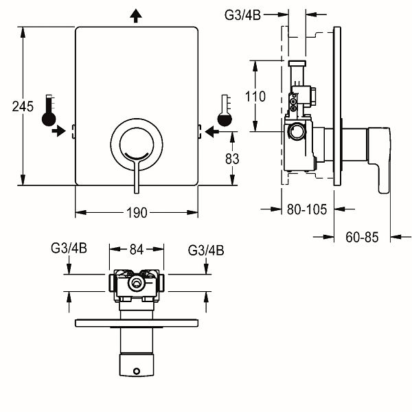 F5L-Therm Thermostat-Einhebelmischer DN 15 als Fertigbauset zur Wandeinbaumontage im Rohbauset, für Duschanlagen. Zum Anschluss an Warm- und Kaltwasser. Funktionsblock mit integrierter Thermostatkartusche und Vorrichtung für optionale Hygieneeinheit zur Durchführung einer automatischen Hygienespülung, programmgesteuerten thermischen Desinfektion (zusätzliche Bypass-Magnetventilkartusche notwendig) und Speicherung von Statistikdaten. Thermostatisch gesteuerte Mischkartusche mit Dehnstoffelement, Sicherheitsabschaltung bei Kaltwasserausfall, einstellbarem, verdrehsicherem Temperaturanschlag und Keramikscheibentechnik. Ganzmetallausführung, sichtbare Teile poliert verchromt. Halterahmen inklusive Profildichtung, Edelstahlabdeckplatte 190 x 245 mm mit verdeckter Schraubbefestigung, verchromte Kunststoffrosette, Rückflussverhinderer und Sieben. Tiefenverstellbarkeit 25 mm.
