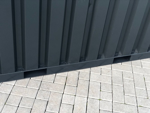 Das Untergestell besteht aus robusten und verzinkten Metallträger. Das Untergestell verläuft sich rund um den Container, das ermöglicht die Montage auch bei Unebenheiten.