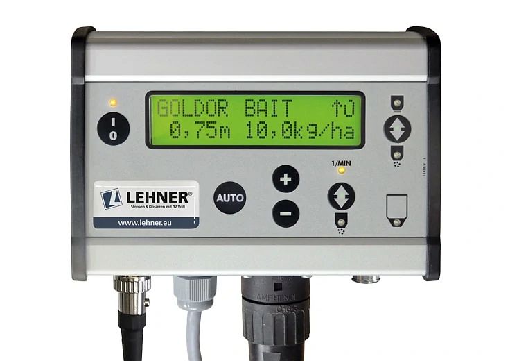 Neben der Einstellung der Ausbringmenge mithilfe der Drehzahleinstellung der Zellenradschleuse, lassen sich auch alle weiteren Funktionen vom Bedienteil aus vornehmen wie z. B. Ein/Aus, Start/Stopp, EHR-Signal einstellen, automatische Restentleerung, elektrisches Abdrehen und Anlegen eigener Produkte (Streutabellen). Fünf auswählbare Sprachen und ein Programmspeicher für bis zu 12 Abdrehproben machen das Arbeiten noch komfortabler. Zudem ist die geschwindigkeitsabhängige Dosierung via 7-polige Signalsteckdose oder Radsensor ebenfalls möglich (Zubehör).