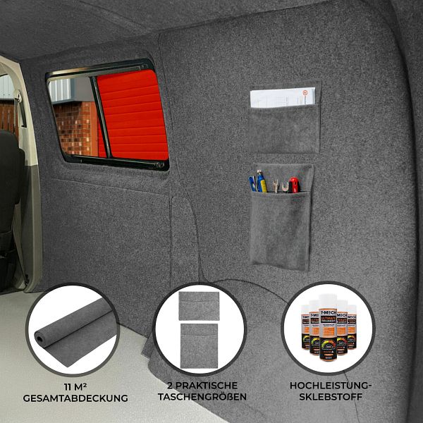 Ob zur Verbesserung des Komforts, zur Pflege Ihres Fahrzeugs oder zur optimalen Nutzung des Stauraums – unser rauchgraues Set aus Autostoff, Aufbewahrungstaschen und Kleber ist die ideale Lösung für jedes Fahrzeug.
