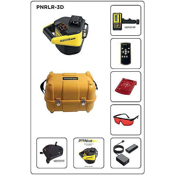 - Lieferumfang: Rotationslaser PNRLR-3D (rot), Lithium-Ionen-Akku und Ladegerät, Handempfänger PNLUD18, Zieltafel, Laserbrille, Fernbedienung, Transportkoffer, Bedienungsanleitung
