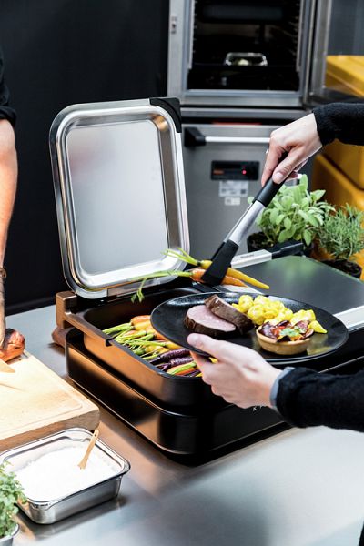 Das funktional designte Auftischgerät im 1/1 GN-Maß mit elektronisch steuerbarem, energiesparendem Cerankochfeld dient zum automatischen Regenerieren von kalten oder warmen Speisen, Warmhalten, Kochen, Dampfgaren oder Braten mit GN-thermoplates®. Der Anti-Chafing-Dish für unkompliziertes, multifunktionales Catering mit bester Speisenqualität.