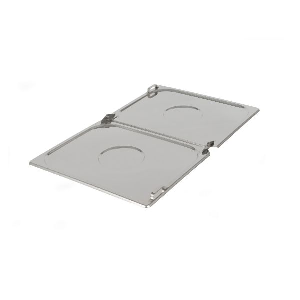 Der mittig klappbare GN-Flachdeckel mit Scharnier aus Edelstahl, minimaler Temperaturverlust durch das halbseitige Öffnen - in Anwendung mit Edelstahl GN-Behältern.