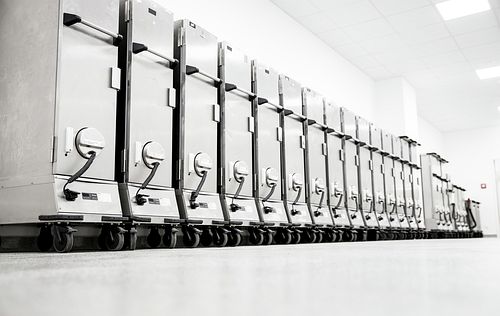 Rieber thermoport® aus Kunststoff und Edelstahl sind miteinander kombiniert stapelbar und auf den Transport- bzw. Ausgabewagen abstellbar – für einen rutschfesten und sicheren Transport.