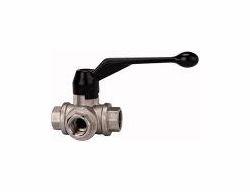 3-Wege-Kugelhahn, T-Bohrung, leichte Ausführung, Messing vernickelt, Mediums-/ Umgebungstemperatur -15 °C bis 100 C, Rp 1/2, DN 15, PN max. 40 bar. Allseitig abdichtende Ausführung mit T-Bohrung. Dieses Modell keine 180 -Hebeldrehung, sondern lediglich 90. Somit sind anstelle von 4 lediglich 2 Schaltstellungen möglich.