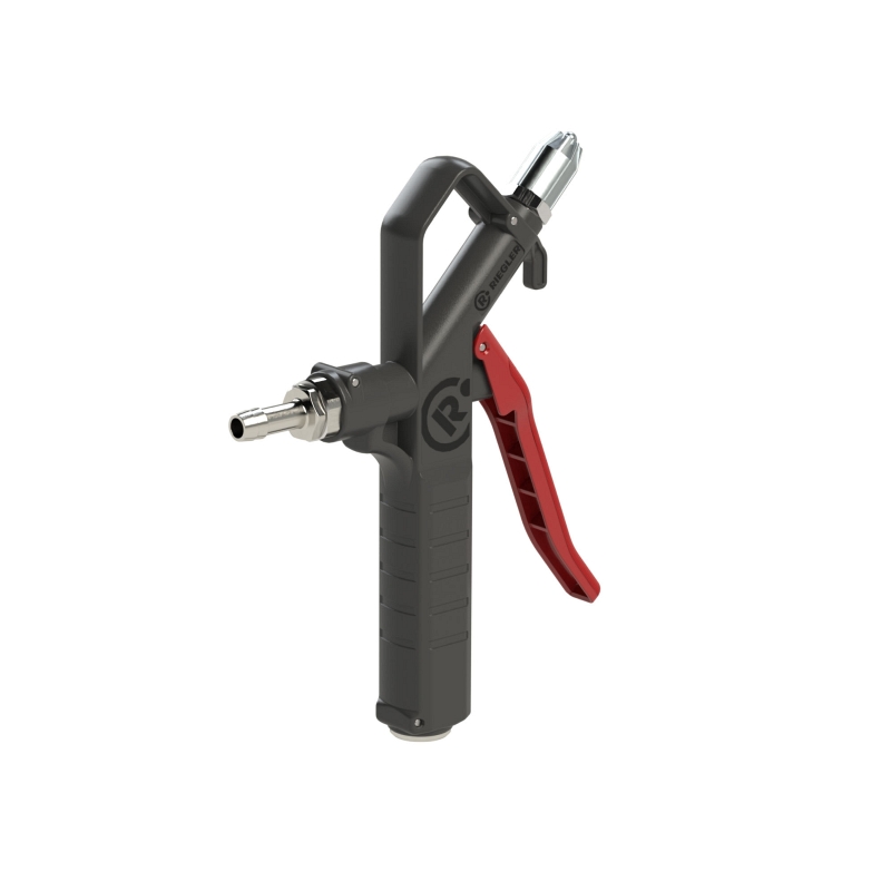 Dosierbare Blaspistole, Kunststoff, Sicherheitsdüse, oben anschließbar, PN max. 12 bar, Tülle LW 6. Zum Ausblasen und Reinigen von Maschinen, Motoren, Lagern, Gleitflächen, Bohrungen aller Art, Hohlkörpern, Formen usw.