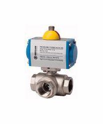 3-Wege-Messingkugelhahn, pneumat. Stellantrieb, T-Bohrung, Messing vernickelt, Betriebstemperatur -20 °C bis 70 C, Rp 1 1/4, DN 32, PN max. 40 bar. 3-Wege-Hahn, L-Bohrung oder T-Bohrung, voller Durchgang. Pneumatischer Schwenkantrieb in doppelt- oder einfachwirkender Ausführung und integriertem Stellungsanzeiger.