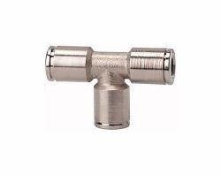 T-Steckverbindung metallica, für Schlauch-Außen-Ø 4 mm, Arbeitsdruck max. 16 bar, Betriebstemperatur -20 °C bis 150 C, Messing vernickelt. Schnellsteckverbindungen komplett aus Messing vernickelt. Die Teile mit zylindrischem Gewinde sind mit einem FKM-O-Ring ausgestattet. Die konischen Gewinde sind mit der Dispersion preCOTE 5 beschichtet, so dass alle Verbindungen dieser Serie auch bei hohen Temperaturen eingesetzt werden können (Medium Druckluft).