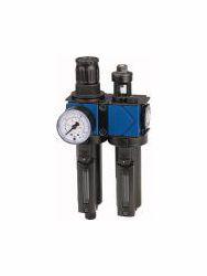 Wartungseinheit 2-tlg. variobloc mit Metallbehälter inkl. Sichtrohr und Tropfaufsatz Metall, BG 1, G 3/8, PE max. 20 bar. Zweiteilige Wartungseinheiten bestehend aus einem vordruckunabhängigen, rücksteuerbaren Membrandruckregler mit Sekundärentlüftung in Verbindung mit einem Zentrifugalabscheider und einem Proportionalöler. Bewährte Serie in modernem Industriedesign, die sich durch einfaches Handling, bequeme Verblockungsmöglichkeit durch neuartige Verbindungsmodule und hervorragende Durchflusswerte auszeichnet.