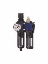 Wartungseinheit 2-tlg. variobloc, Polycarbonatbehälter und Schutzkorb, BG 1, G 3/8, PE max. 16 bar, Mediums- und Umgebungstemperatur max. 50 C. Zweiteilige Wartungseinheiten bestehend aus einem vordruckunabhängigen, rücksteuerbaren Membrandruckregler mit Sekundärentlüftung in Verbindung mit einem Zentrifugalabscheider und einem Proportionalöler. Bewährte Serie in modernem Industriedesign, die sich durch einfaches Handling, bequeme Verblockungsmöglichkeit durch neuartige Verbindungsmodule und hervorragende Durchflusswerte auszeichnet.