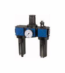 Wartungseinheit 3-tlg. variobloc mit Metallbehälter inkl. Sichtrohr und Tropfaufsatz Metall, BG 2, G 3/4, PE max. 20 bar. Dreiteilige Wartungseinheiten bestehend aus einem vordruckunabhängigen, rücksteuerbaren Membrandruckregler mit Sekundärentlüftung in Verbindung mit einem Zentrifugalabscheider und einem Proportionalöler. Bewährte Serie in modernem Industriedesign, die sich durch einfaches Handling, bequeme Verblockungsmöglichkeit durch neuartige Verbindungsmodule und hervorragende Durchflusswerte auszeichnet.