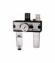 Wartungseinheit 3-tlg. multifix mit Polycarbonatbehälter, BG 1, G 3/8, Eingangsdruck max. 16 bar, Regelbereich 0,5 - 10 bar. Dreiteilige Wartungseinheiten, bestehend aus einem vordruckunabhängigen, rücksteuerbaren Membrandruckregler mit Sekundärentlüftung, einem Zentrifugalabscheider und einem Proportionalöler.