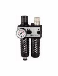 Wartungseinheit 2-tlg. multifix, PC-Behälter und Schutzkorb, BG 1, G 3/8, Eingangsdruck max. 16 bar, Regelbereich 0,5 - 10 bar. Zweiteilige Wartungseinheiten, bestehend aus einem vordruckunabhängigen, rücksteuerbaren Membrandruckregler mit Sekundärentlüftung in Verbindung mit einem Zentrifugalabscheider und einem Proportionalöler.
