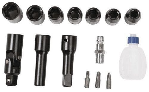 - Inklusive 7 x 1/2" Steckschlüssel, 1 x 1/2" Verlängerung, 1 x Kardangelenk, 1 x Bithalter, 3 x Bit 1 x Öl-Fläschchen
