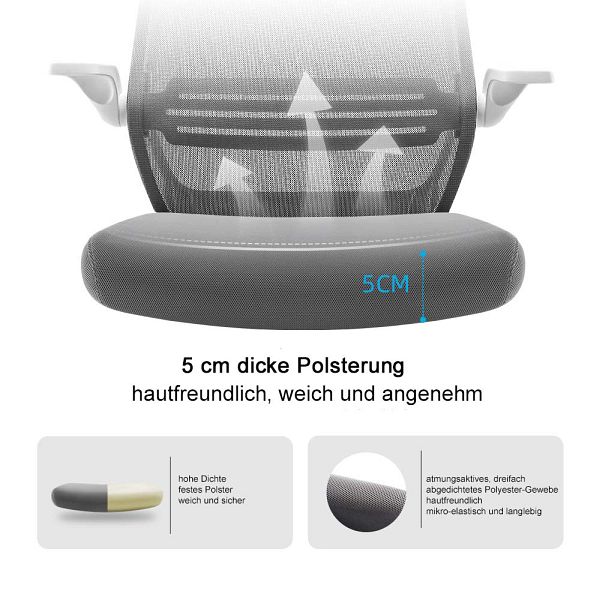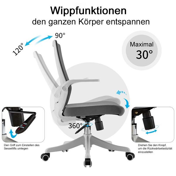 Der Bürostuhl in modernem Design ist nicht nur etwas fürs Auge, sondern erfüllt höchste Ansprüche in Sachen Komfort und Stabilität. Die ergonomische Rückenlehne mit Netzbespannung lässt sich flexibel nach hinten neigen und ermöglicht Ihnen eine aufrechte, gesunde Sitzhaltung. Ihr Rücken, Nacken und die Lendenwirbel werden optimal gestützt. Die in der Höhe verstellbare Lendenwirbelstütze können Sie individuell der natürlichen Krümmung Ihrer Wirbelsäule anpassen. So wird der Lendenwirbelbogen im Sitzen optimal abgefedert, der Computerstuhl entlastet Ihre Wirbelsäule und Bandscheiben, und beugt somit Rückenprobleme vor. Die Sitz- und Lehnenhöhe sind per Federgriff verstellbar und exakt an Ihren Körper anpassbar. Außerdem verfügt dieser Bürostuhl über eine Wippfunktion, die flexibel jeder Bewegung Ihres Oberkörpers folgt. Die luftdurchlässige Netzbespannung und der Meshbezug der Sitzfläche lässt Sie auch bei höheren Temperaturen entspannt länger sitzen. Und sollten Sie einmal Pause machen, können Sie den Stuhl, dank der um 90° hochklappbaren Armlehnen, platzsparend ganz an Ihren Schreibtisch heranfahren.