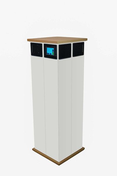 Der Smart Air Tower saugt über seine innovative Luftstromtechnologie Umgebungsluft an und führt diese in die Desinfektionskammer im Inneren des Gehäuses, in welcher UVC-Lampen die Luftbestrahlen. Die energiereiche UVC-Strahlung ist in der Lage, die DNA von Mikroorganismen aufzubrechen und so die Mikroorganismen zu zerstören. Es gelangt aufgrund unserer besonderen Gehäusekonstruktion keine UVC-Strahlung nach außen. Den Smart Air Tower können Sie somit auch bedenkenlos während der Anwesenheit von Personen im Raum nutzen. Gegenüber seinem Vorgänger bietet der Smart AirTower - Gen2 eine Vielzahl an neuen technischen Erweiterungen: UVC-Technologie kombiniert mit digitalen Möglichkeiten. Herzstück des neuen Towers ist ein Display, welches per Touchscreen bedient wird und relevante technische Daten zur Raumluft und zum Gerät anzeigt. Auf dem modernen Display zeigt Ihnen der Smart Air Tower – Gen2 unter anderem den CO2-Gehalt der Luft, die Raumtemperatur, Betriebsstunden u.v.m. explizit an. Der Tower verfügt über eine integrierte CO2-Ampel, die mittels modernster Sensorik eine automatische Luftreinigungsleistung des Geräts bei steigenden CO2-Gehalt in der Luft steuert. Der SAT – Gen2 weist Sie zudem darauf hin zu lüften, wenn der Sauerstoffgehalt in der Luft zu weit absinkt. Es besteht die Möglichkeit die Ampelautomatik auch manuell über den Touchscreen aus- und anzuschalten.