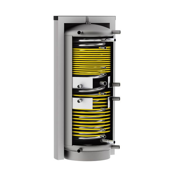 Hygiene-Schicht-Kombispeicher HSK-SLS mit großflächigem Edelstahlwellrohr zur legionellensicheren Trinkwassererwärmung sowie zwei großdimensionierten Solar-Ovalrohrwärmetauschern.