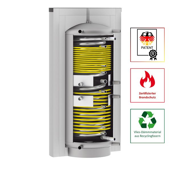 Hygiene-Schicht-Kombispeicher HSK-SLS mit großflächigem Edelstahlwellrohr zur legionellensicheren Trinkwassererwärmung sowie zwei großdimensionierten Solar-Ovalrohrwärmetauschern.