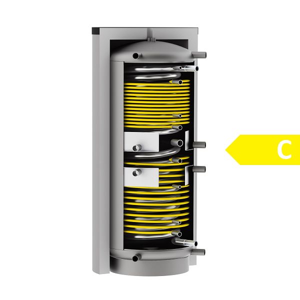 Hygiene-Schicht-Kombispeicher HSK-SLS mit großflächigem Edelstahlwellrohr zur legionellensicheren Trinkwassererwärmung sowie zwei großdimensionierten Solar-Ovalrohrwärmetauschern.