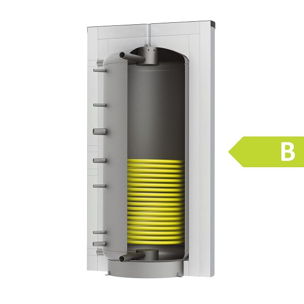 Schichtleit-Pufferspeicher SLS mit großflächigem Solarwärmetauscher und patentiertem thermohydraulischem Schichtleitsystem "SLS".