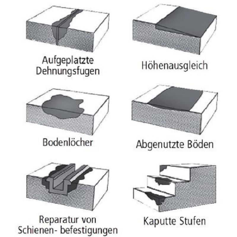 - vielseitiger Einsatz für z.B. Löcher, Dehnungsfugen, Stufen, Rampen oder Metallschienen