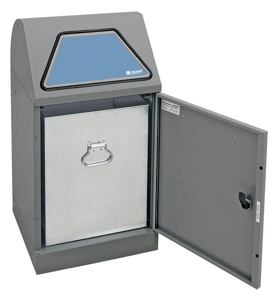 Der Sammler ist aus vollständig verzinktem Qualitätsstahlblech gefertigt und hochwertig strukturiert pulverbeschichtet. Im Behälterinnern sorgt ein Innenbehälter aus ebenfalls verzinktem Stahlblech für optimale Abfallaufnahme. Das Fassungsvermögen beträgt 45 Liter. Der Innenbehälter wird durch eine frontseitig eingelassene und per Vierkantschloss verschließbare Flügeltüre entnommen (Vierkantschlüssel wird mitgeliefert). Die Einwurfklappe schließt mittels Dämpfer verzögert und geräuschlos. Behälter feuer- und geruchshemmend. Zur farblichen Kennzeichnung der Einwurfklappe liegt dem Sammler ein Set mit 4 ProPads (= protect-pads, hochrobust, selbstklebend) in den Farben blau, gelb, grün und anthrazit bei. So entscheidet der Anwender selbst, welche Kennzeichnungsfarbe der Sammler tragen soll. Frontseitig sorgen 2 Stellfüße für den Ausgleich bei Unebenheiten. Der Behälter kann mit dem Rollensatz Art. -Nr. 5407000 auch nachträglich zur fahrbaren Variante umgerüstet werden. Dann beträgt die Gesamthöhe 900 mm. Der Behälter wird vollständig in Deutschland gefertigt. Der Hersteller gewährt eine Garantie von 5 Jahren. Außerdem ist der Behälter selbstlöschend und als nicht brennbar eingestuft (gem. DIN 4102, Brandschutzklasse A1). Farbgebung Korpus: graualu-struktur, Farbgebung Einwurfklappe: ProPads