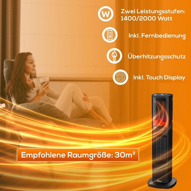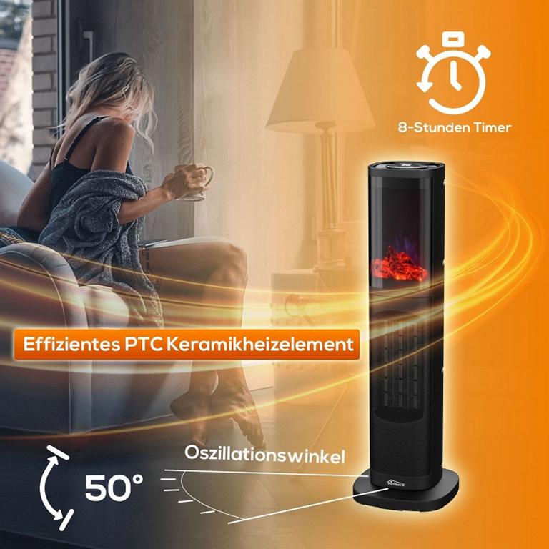 TroniTechnik Turmheizer mit Keramikelement,Heizgerät mit simulierten Flammeneffekt,2000 W,Wärmestrahler mit PTC Keramik, Schwarz, 5464