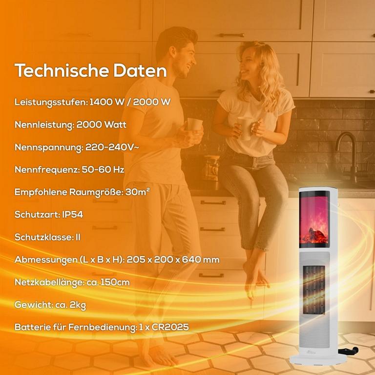 TroniTechnik Turmheizer mit Keramikelement,Heizgerät mit simulierten Flammeneffekt,2000 W,Wärmestrahler mit PTC Keramik, Weiß, 5463