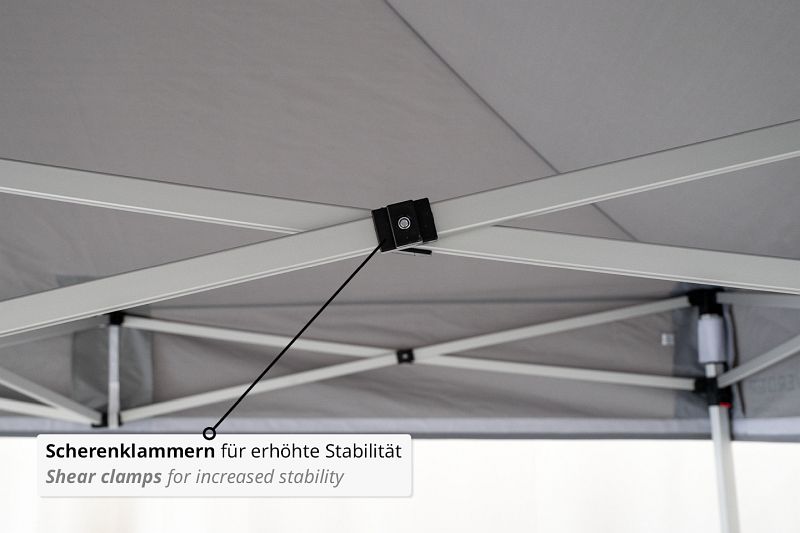 Das Zeltgestell verfügt über Hexagon 40mm Standbeine aus eloxiertem Aluminium mit einer Wandstärke von 1mm. Dadurch wird die Leichtigkeit dieses Zeltgestells erreicht. Die Stabilität entsteht durch das robuste Material Aluminium, die starken Scheren mit Stützrippen und aus der Gesamtkonstruktion. Diese wird verbunden durch Nylonverbinder in planenschonendem Design. Sollte einmal etwas kaputt gehen sind sämtliche Ersatzteile verfügbar. Die Reparatur ist einfach, da sämtliche Teile verschraubt sind.