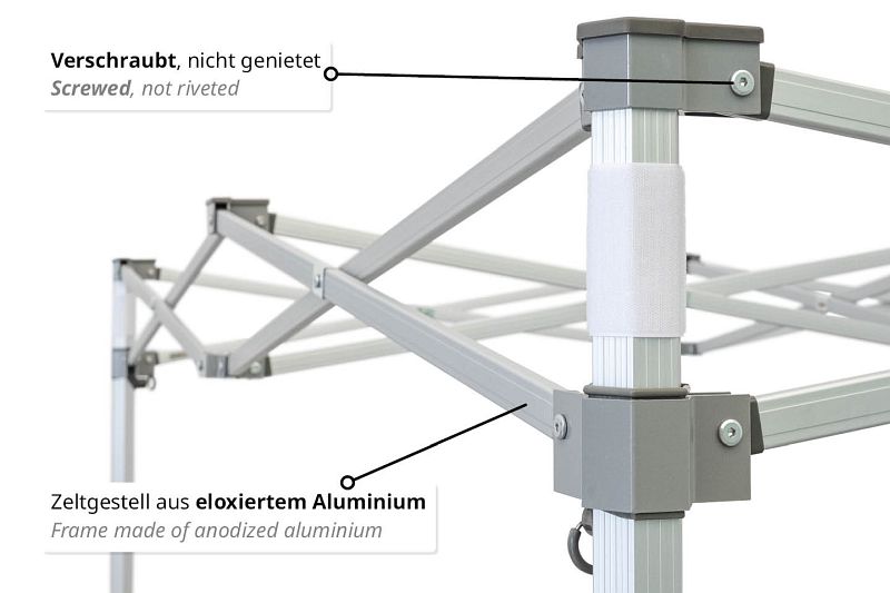 Das Zeltgestell besteht aus Aluminium. Die Hexagon Standbeine aus eloxiertem Aluminium mit 56 mm Durchmesser haben eine Wandstärke von 2 mm. Dadurch wird die Stärke und das Gewicht dieses robusten Zeltgestells erreicht. Verstärkt wird die Stabilität und Wetterfestigkeit noch durch das robuste Material Aluminium, das gerillte Profil, die starken Scheren und durch die Gesamtkonstruktion. Die Teile werden verbunden durch stranggepresste Aluminiumverbinder mit Deckkappen aus Kunststoff. So wird die Plane vor Ecken und Kanten geschützt. Sollte einmal etwas kaputt gehen sind sämtliche Ersatzteile verfügbar. Die Reparatur ist einfach, da sämtliche Teile verschraubt sind.