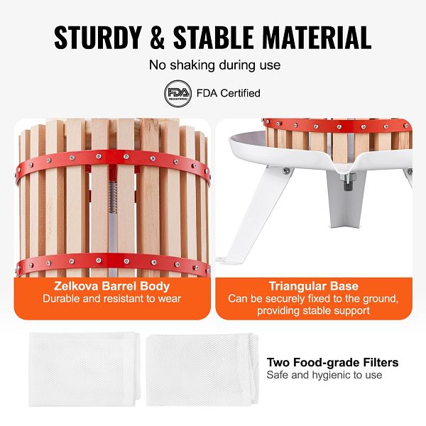 - Gebaut wie ein Meister: Mit dem soliden Zelkova-Gehäuse und den robusten Pressblöcken ist diese Obst- und Weinpresse für den Dauereinsatz gerüstet, ganz zu schweigen von der glatten, gratfreien Oberfläche, die das Trennen von Saft und Trester zum Kinderspiel macht. Sie ist eine robuste Maschine, bei der Ihre Sicherheit an erster Stelle steht.