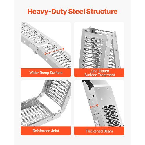 Stahlrampe: Die Ganzstahlkonstruktion zeichnet sich durch Präzisionsschweißen mit dicht versiegelten Verbindungen, eine weiß verzinkte Oberfläche für Korrosionsbeständigkeit und eine glatte, gratfreie Oberfläche aus. Die verdickte, verbreiterte Rampenoberfläche sorgt für eine gleichmäßige Gewichtsverteilung und verhindert ein Verbiegen oder Zusammenbrechen bei längerem Gebrauch