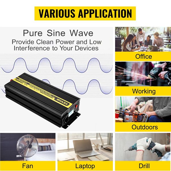 - Vielfältige Anwendungen: Dieser Wechselrichter wurde für Geräte entwickelt, die einen sorgfältigen Schutz benötigen, um eine stabilere reine Sinuswelle zu liefern. Dieser Wechselrichter ist mit dem universellen Standard gebaut, geeignet für Elektrowerkzeuge, Bürobedarf, Haushalt / Küchengeräte
