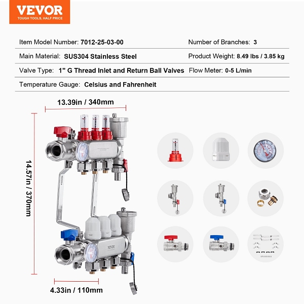 - Produktparameter: Dieser Heizkreisverteiler verfügt über 3 Heizkreise, 1 Zoll / 2,54 cm Kugelhähne mit G-Gewinde für Zu- und Rücklauf und unterstützt einen Durchfluss von bis zu 5 L/min. Er umfasst 1/2 Zoll / 1,27 cm Adapter und 2 Temperaturanzeigen (zeigt sowohl Fahrenheit als auch Celsius an), was ihn zur idealen Wahl für effiziente Fußbodenheizungssysteme macht.