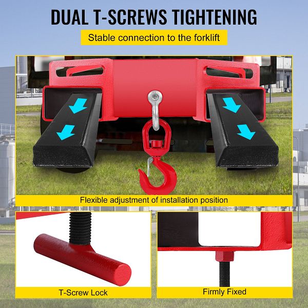 - Einfache Installation: Um den Hebehaken zu befestigen, schieben Sie den Hebehaken einfach über Ihre Palettengabeln durch die Gabeltaschen, klemmen sie zur Sicherheit mit den T-Schrauben fest und befestigen den Haken an Ihrer Nutzlast