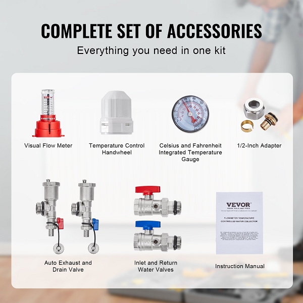 Der Heizkreisverteiler wird mit einem kompletten Zubehör geliefert, einschließlich Montagehalterungen und einfachen Anweisungen für eine problemlose Installation. Sie können es ganz einfach installieren, indem Sie der klaren Anleitung folgen, ohne professionelle Hilfe zu benötigen.