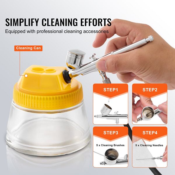 - Leicht zu reinigen: Unser Airbrush-Set enthält einen Reinigungstopf, Reinigungsbürsten und Reinigungsnadeln, sodass Sie kein zusätzliches Werkzeug für eine effiziente und gründliche Airbrush-Reinigung kaufen müssen. Auch schwer zugängliche Ecken und Kleinteile können gründlich gereinigt werden.