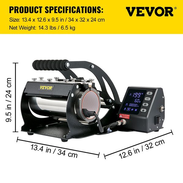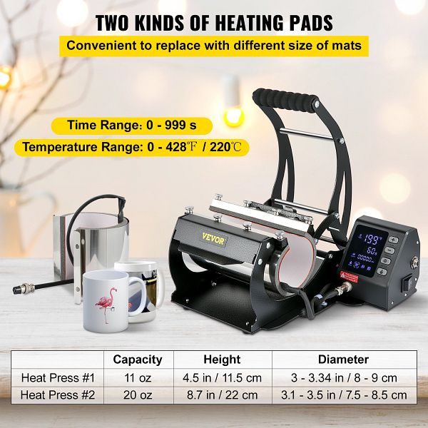 - 11 & 20 Unzen Heizpresse: Zwei Arten von Heizplatten für Becher sind im Lieferumfang enthalten. So können Sie zwischen zwei verschiedene Größen wechseln. 11 Unzen Presse: 11,5 cm (4,52 Zoll) hoch, geeignet für Tassen mit einem Durchmesser von 8-9 cm (3,15-3,54 Zoll). 20 Unzen Presse: 22 cm (8,66 Zoll) hoch, geeignet für Tassen mit einem Durchmesser von 7,5-8,5 cm (2,95-3,35 Zoll). Einfache Montage und Zusammenbau. Zwei verschiedene Heizplatten bietet Ihnen mehr Gestaltungsmöglichkeiten