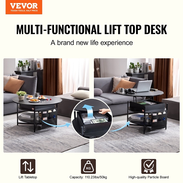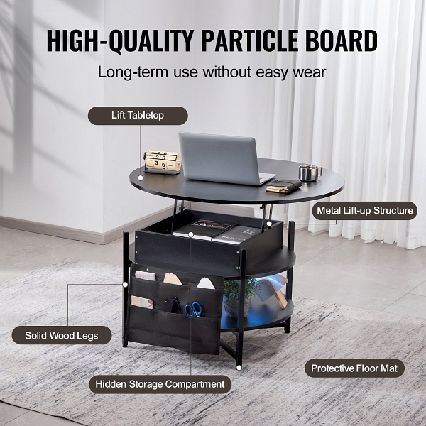 VEVOR Couchtisch Wohnzimmertisch Anhebbar Kaffeetisch Rund 90cm Sofatisch, KFZ35YXWYBKFA7BWYV9, 0197988217442