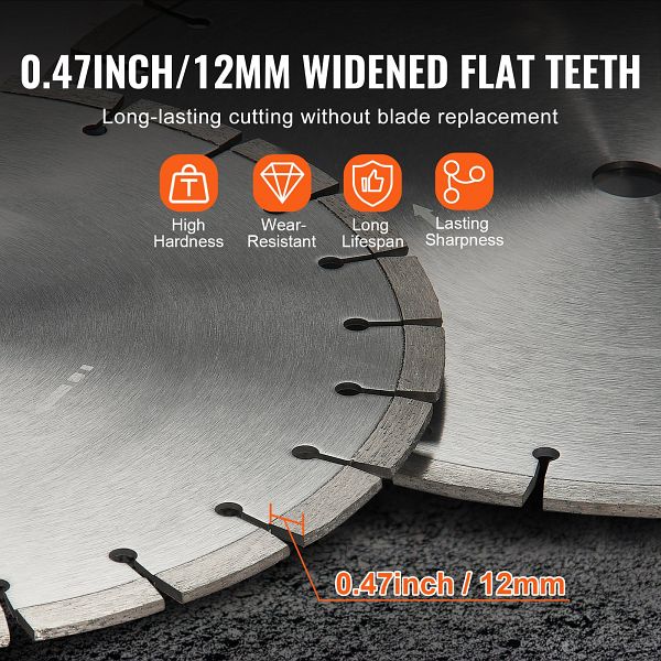- Effiziente & stabile Leistung: Die flache Zahnform sorgt für hohe Wirtschaftlichkeit, Geschwindigkeit und Schnittgenauigkeit. Das Betonsägeblatt erzielt hochpräzise Schnitte mit sauberen, gratfreien Kanten. Die um 0,47 Zoll (12 mm) verbreiterten Segmente erhöhen die Standzeit zusätzlich und sorgen für schnelles und stabiles Schneiden über lange Zeiträume, ohne dass das Sägeblatt gewechselt werden muss.