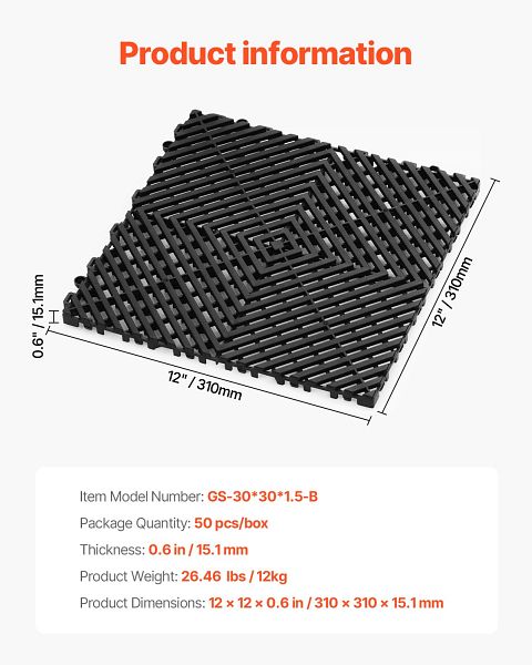 VEVOR Drainagematte Garage Bodenfliesen, Ineinandergreifend 31x31cm Schwarz, VE: 50 Stück, CKPSD12X12INH8T9BV0, 0197988485193