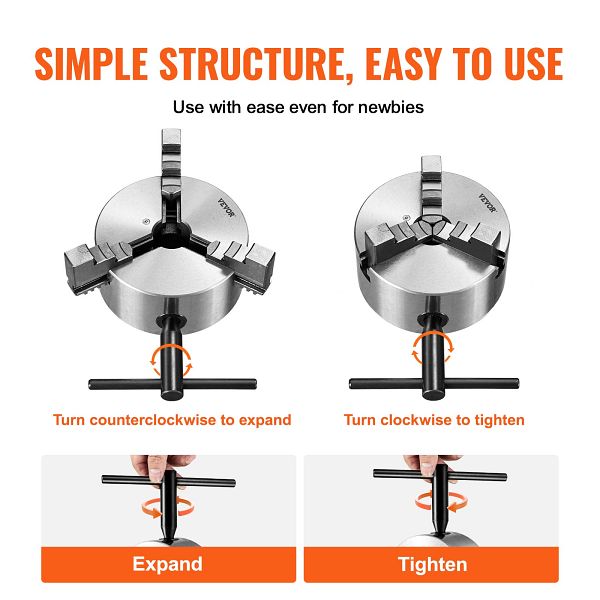 - Innen- & Außenbacke: Das selbstzentrierende 3-Backen-Drehfutter ist mit einer Innenbacke und einer Außenbacke ausgestattet, um den Spannbereich zu erweitern, und die Außenbacken sind in der Lage, größere Industrieteile zu spannen. Spannbereich: 2 -100 mm. Sie brauchen es nur mit dem T-Schlüssel zu drehen und es an die Größe und Form Ihres Werkstücks anzupassen.