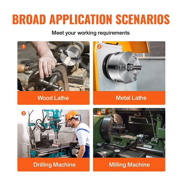 - Anwendbar auf verschiedene Drehmaschinen: Unser selbstzentrierendes Drehfutter ist in hohem Maße anpassungsfähig an Ihre Nutzungsanforderungen, egal ob Sie in der Metallbearbeitung, beim Bohren oder Fräsen arbeiten. Durch den Einsatz unseres Drehfutters können Sie nicht nur die Bearbeitungseffizienz und die betriebliche Flexibilität verbessern, sondern auch genaue und konsistente Ergebnisse erzielen.