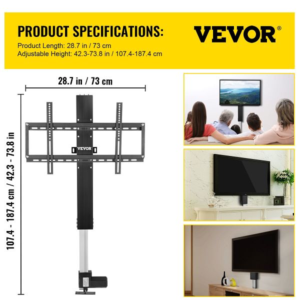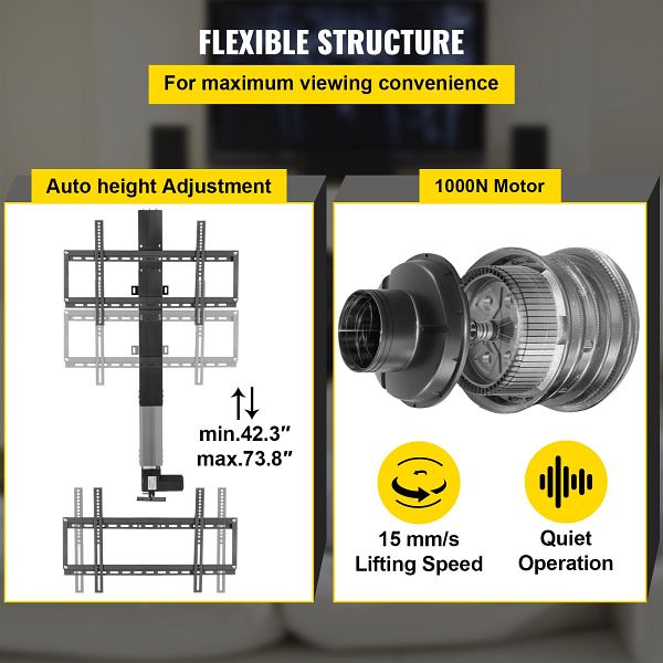 - AUTOMATISCHES ANHEBEN Dieses Produkt unterstützt die 3-stufige Hakeneinstellung. Der Fernsehbildschirm kann mit einer Geschwindigkeit von 15 mm/s schnell zwischen 42,3 und 73,7 Zoll Höhe angehoben oder abgesenkt werden. Leistungsstarker 1000 N Motor für sichere Aufund Abbewegung