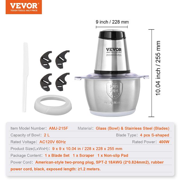 VEVOR Elektrische Küchenmaschine Fleischwolf 400 W, Multifunkitonal Zerkleinerer, 2 L Füllkapazität Standmixer 3000 U/min + 4000 U/min, DMCJRJJLBXG3DGYZSV2, 0840349955322