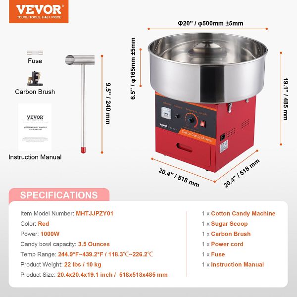 VEVOR Elektrische Zuckerwattemaschine, 1000 W, mit Edelstahlschüssel, Zuckerschaufel und Schublade, Rot, TSMHTJHSWGZMYG5FSV2, 0197988394112