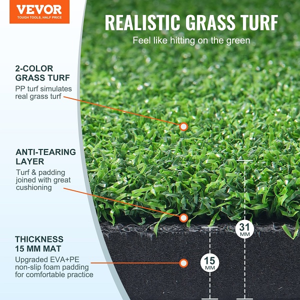 - Realistischer Rasen: Erleben Sie das Gefühl, auf dem Grün zu schlagen, mit unserem zweifarbigen Rasen. Die 5 x 4 Fuß (152 x 122 cm) große Golfmatte ist mit einer reißfesten Schicht versehen und 15 mm dick. Sie bietet eine langlebige und realistische Übungsfläche, die echte Golfplatzbedingungen nachahmt.