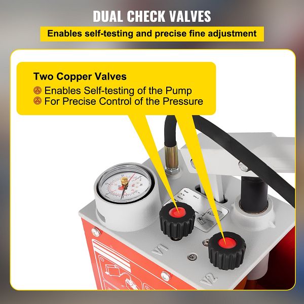 - Zweiventil-System: Unsere Prüfpumpe ist mit zwei Kupferventilen ausgestattet, die eine präzise Feineinstellung des Drucks ermöglichen. Außerdem ermöglicht das Doppelventilsystem genaue und sichere Messergebnisse durch den Selbsttest der Pumpe